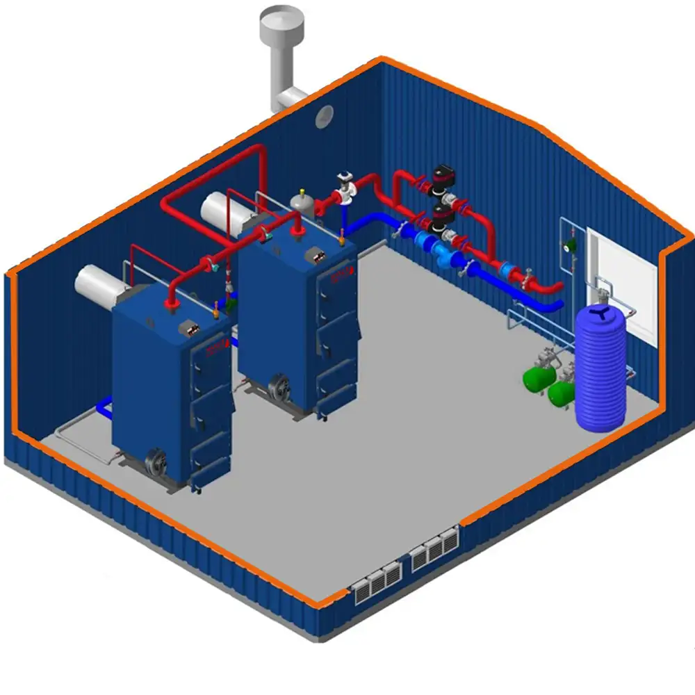 Это минимально необходимый комплект оборудования котельной, который собран в заводских условиях и обеспечивает потребности отопление, вентиляция и горячего водоснабжения.