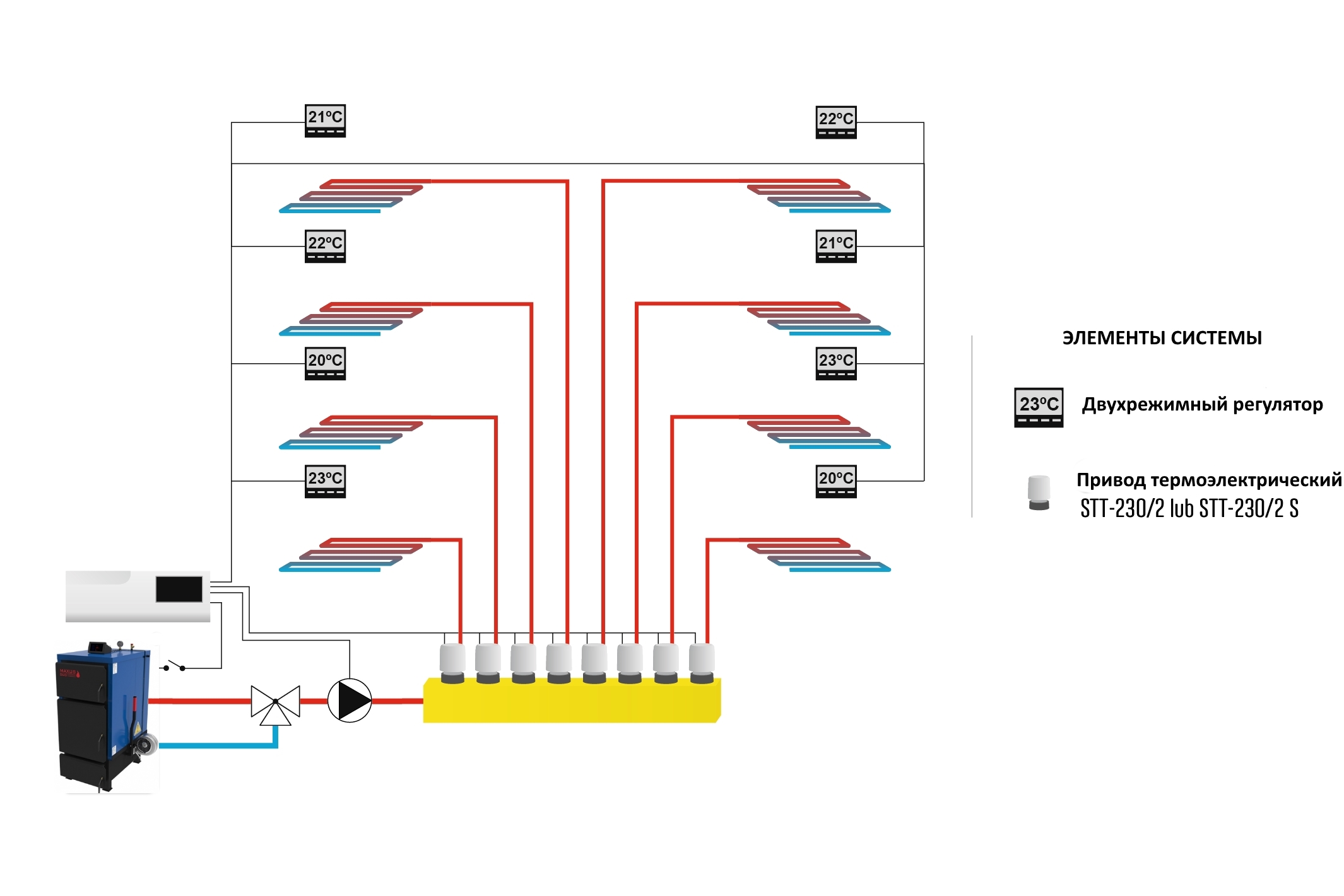 - 5 регуляторов комнатных, имеют возможность обслуживания 10 приводов (каждый макс. после 2 цилиндры)